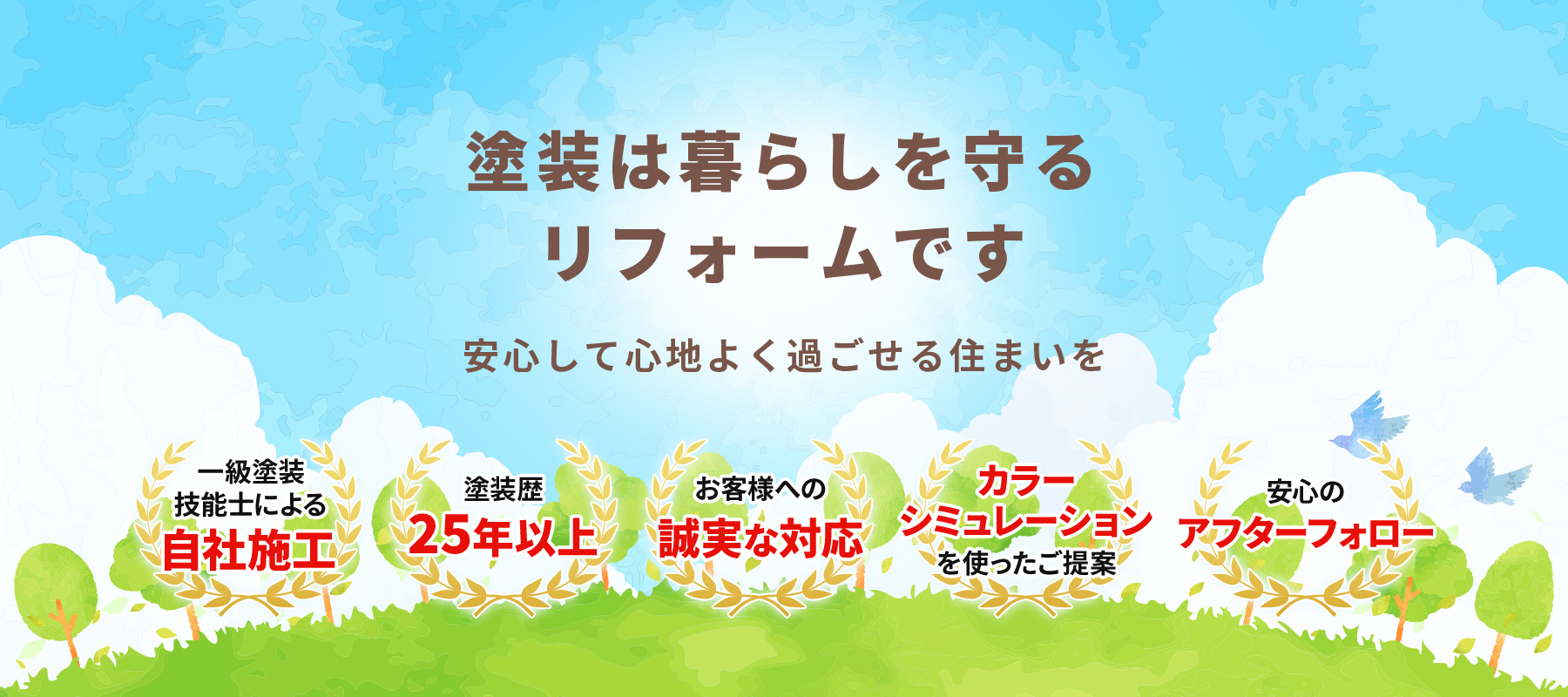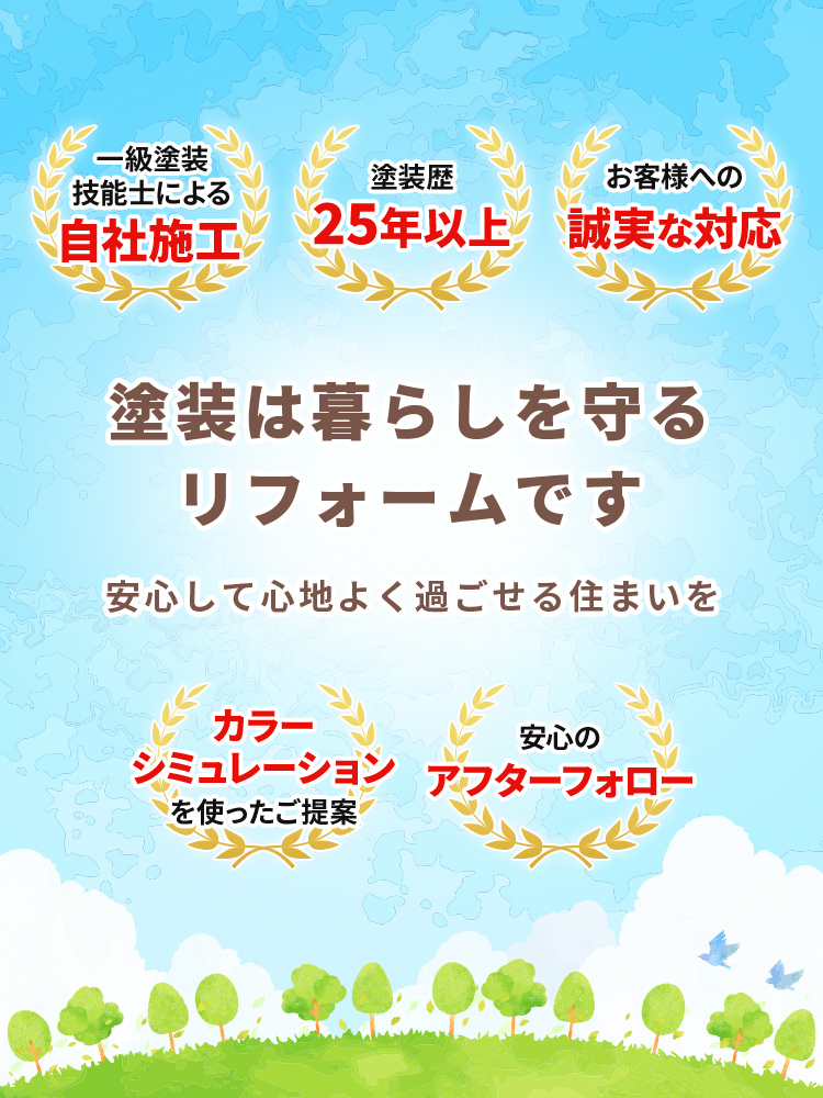 人生で長く付き合い続けるマイホームは、 定期的な修繕工事がつきものです。 任せるとするなら、いつでも相談のできる身近なプロが一番。 みやび塗装では25年以上の実績を持つ一級塗装技能士が、 お客様の信頼を得られるよう、 お見積りから入念な打ち合わせ、丁寧な仕事、綺麗な仕上がりで お客様にご満足していただけるサービスを提供しております。